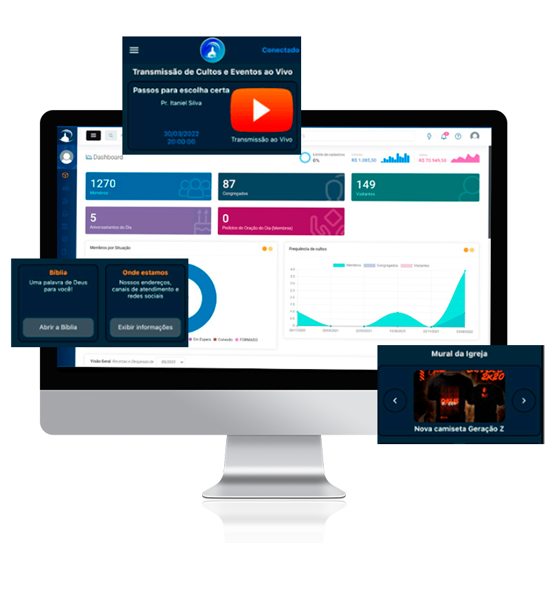 Acompanhamento dos membros, congregados e visitantes, Controle de participação da Escola Bíblica Dominical, cultos e outros eventos, Registre batismo e datas importantes e Registro de atendimento pastoral