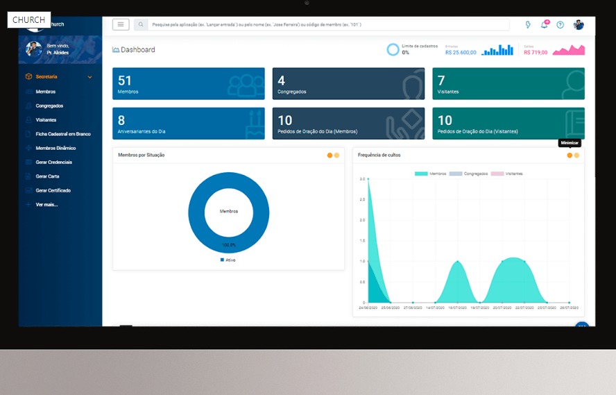A nova atualização do Church traz um Dashboard inovador, com painel online de estatística que exibe em tempo real os números relativos ao andamento das atividades que ocorrem nos principais departamentos da igreja, tanto no módulo de secretaria quanto na tesouraria, como quantidade de membros ativos, congregados, visitantes, pedidos de orações, membros por situação, entradas e saídas além dos gráficos.